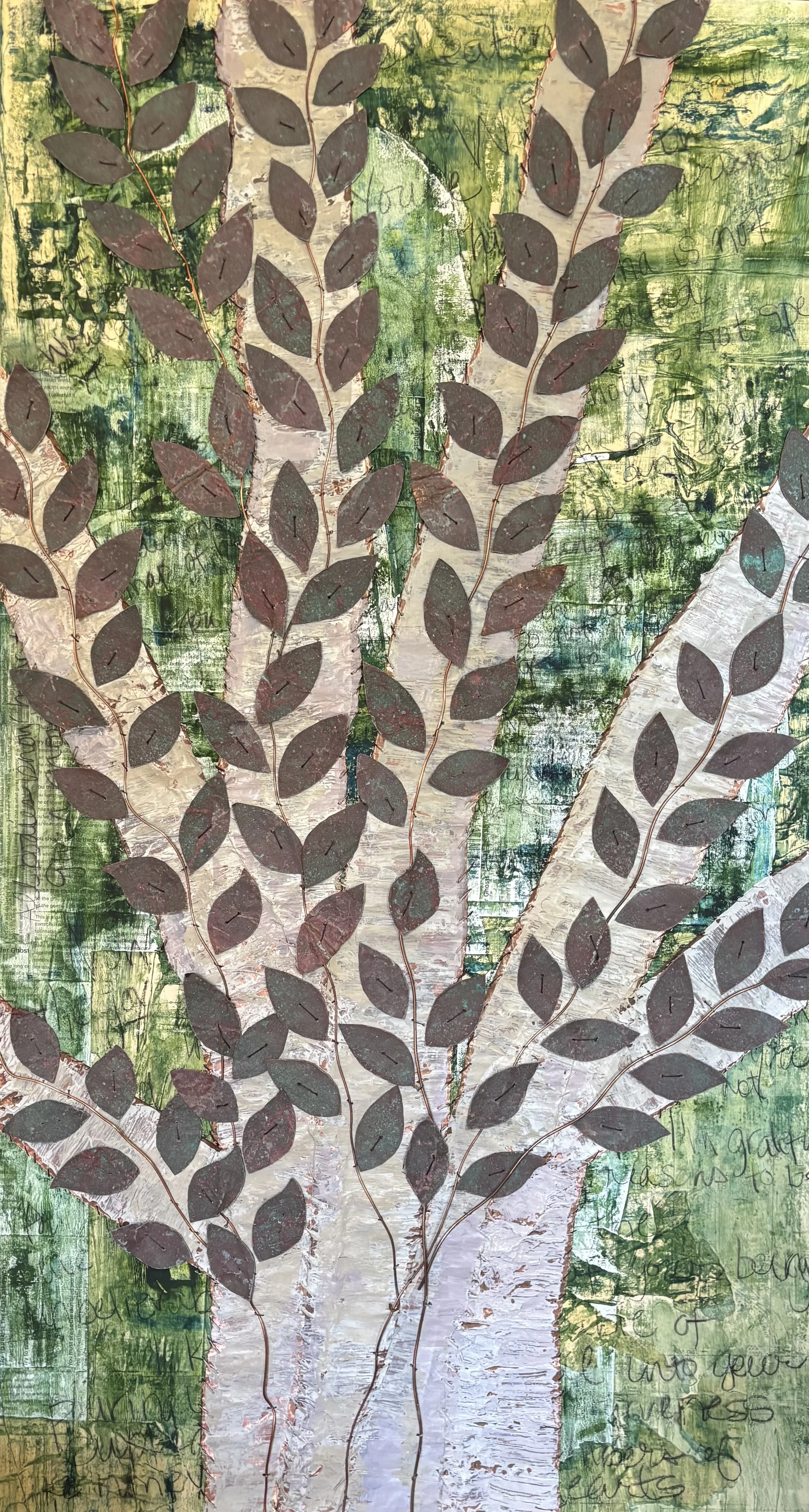 My copper and wire trees sewn onto canvas are ways that I explore these hidden aspects of beauty. Whatever tree inspires me at the time, I follow my curiosity by doing research on that tree and collage papers onto the canvas as the first layer. I may use old history book pages or napkins or old hymnal pages or vintage textured paper or even paper that I make in my home studio. I then layer the paper with oil paint. Then I begin the process of tearing, cutting and sewing on copper trunks, roots, branches and leaves. The copper is treated differently, depending on the particular tree and its parts. Sometimes I patina the copper. Sometimes I paint it. Whatever the process, the trees and the materials that I use always emerge with a new message of beauty and profound truth, if I’m listening.